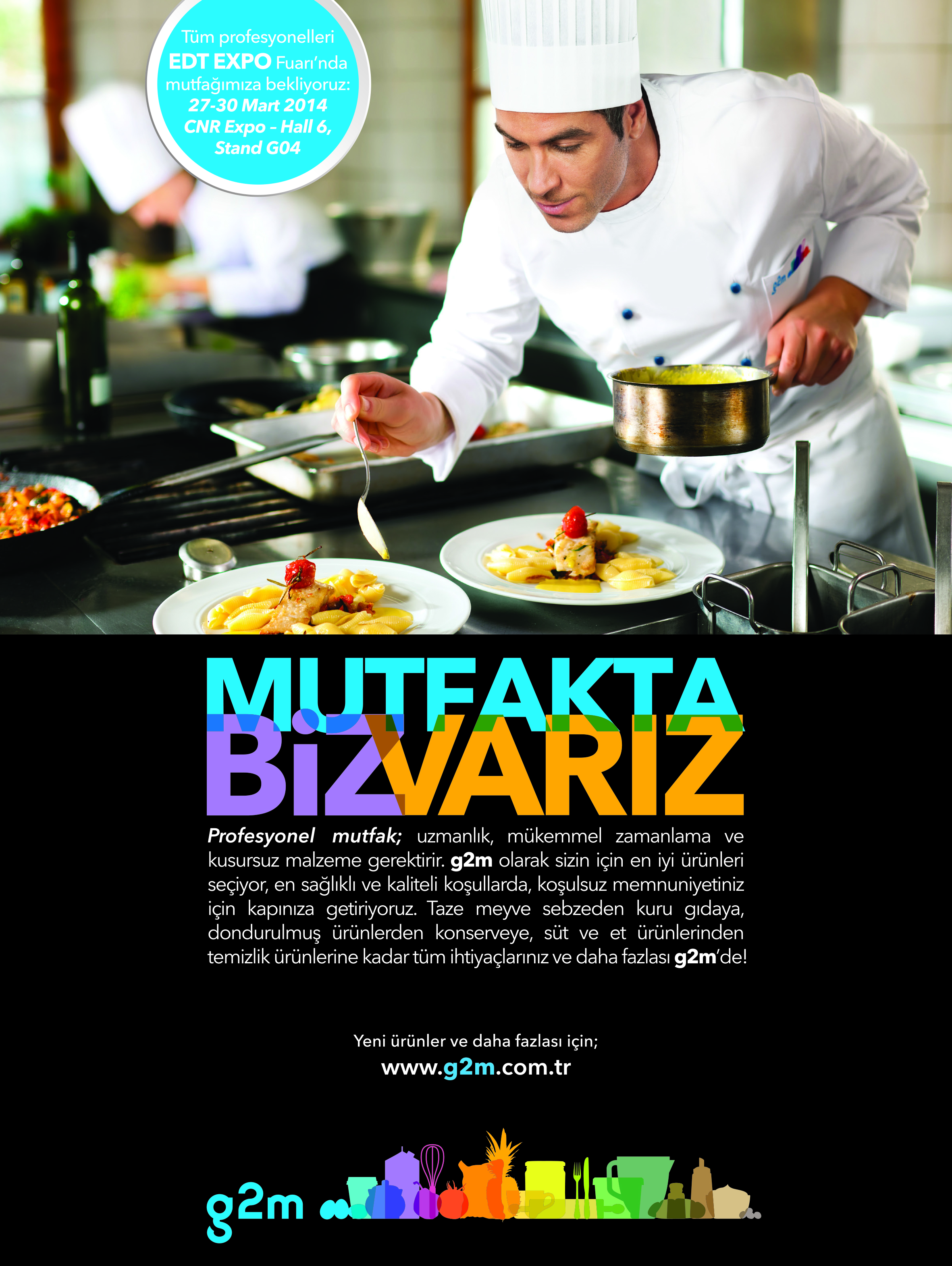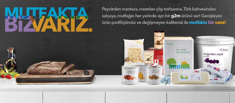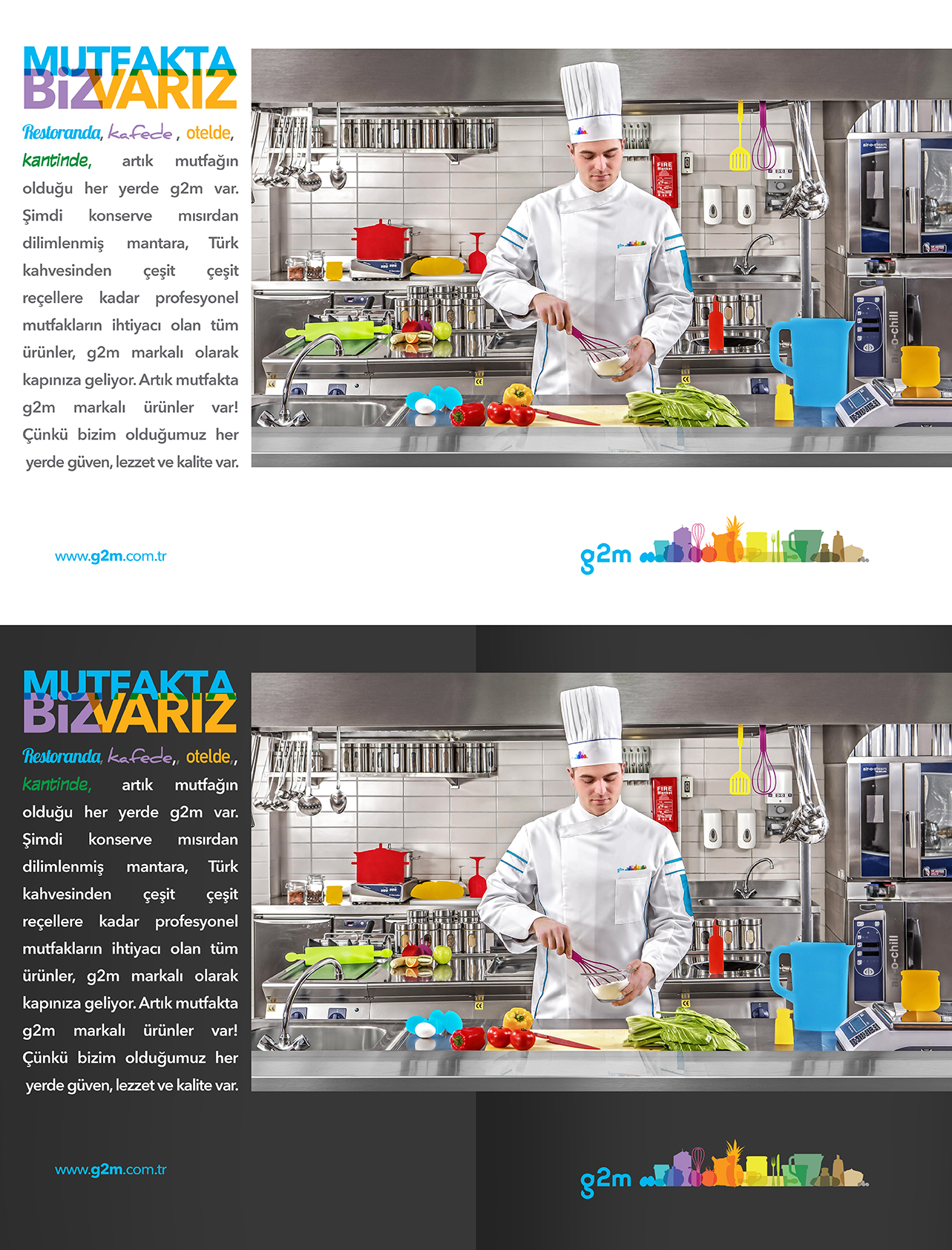 Markanın artık kendi ürünleri ile yer alması “ Mutfakta Biz Varız ” mottosunun çıkış noktası oldu. Aynı zamanda g2m’nin işin mutfağında olduğunu ve sektör profesyonellerinin çözüm ortağı olduğu vurgusunun da altını çizen slogan ana logo ve kurumsal kimlik ile paralel bir tasarım dili ile görselleştirildi.